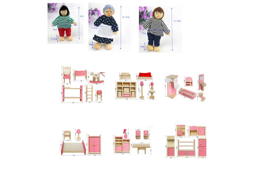 Dollhouse Furniture Pink Bundle - 6 Room Sets and 8 Dolls