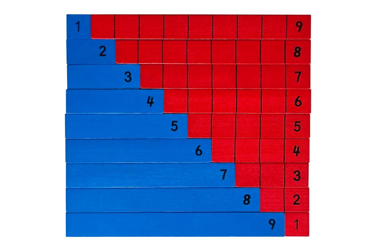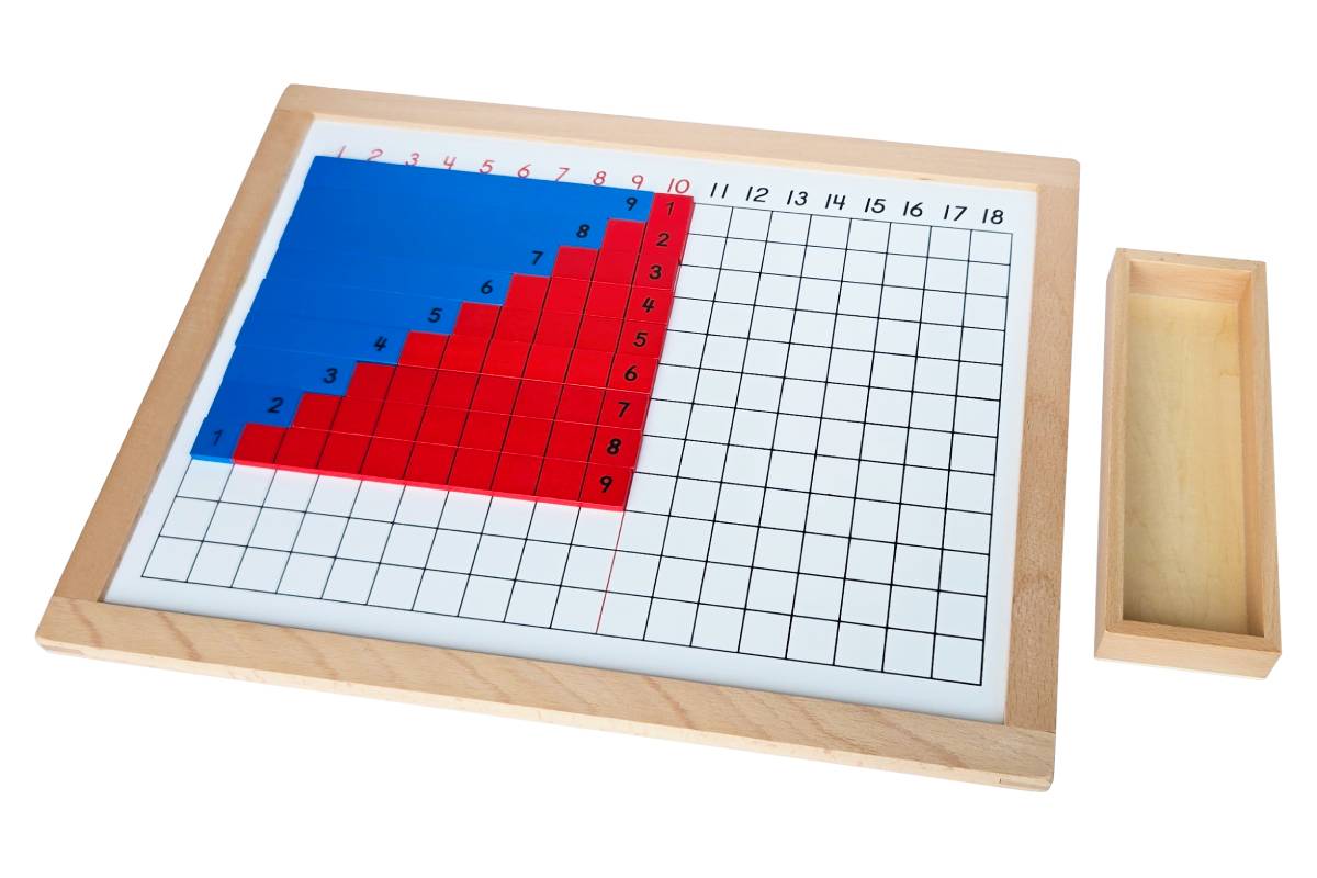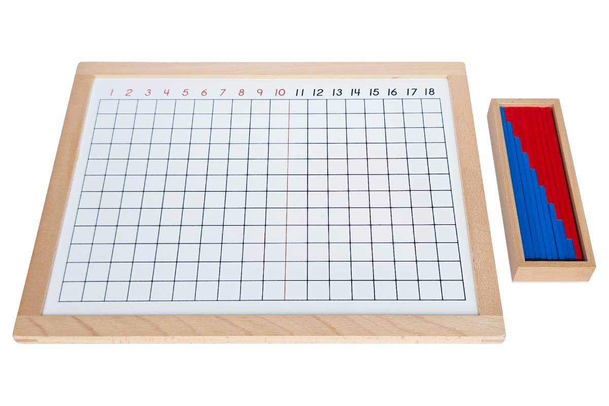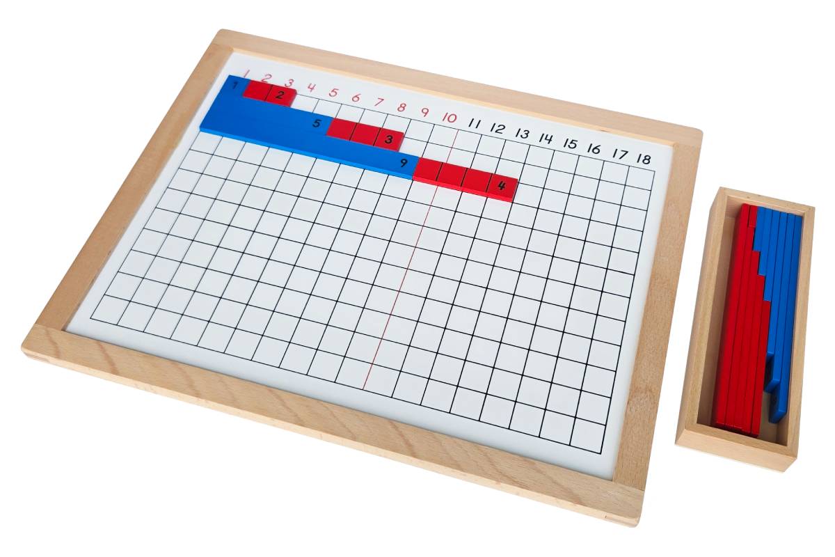 Wooden board with 12 by 18 squares with the numerals 1-18 printed across the top. A wooden box contains 9 red wooden strips and 9 blue wooden strips of varying lengths, both printed with the numerals 1 to 9.